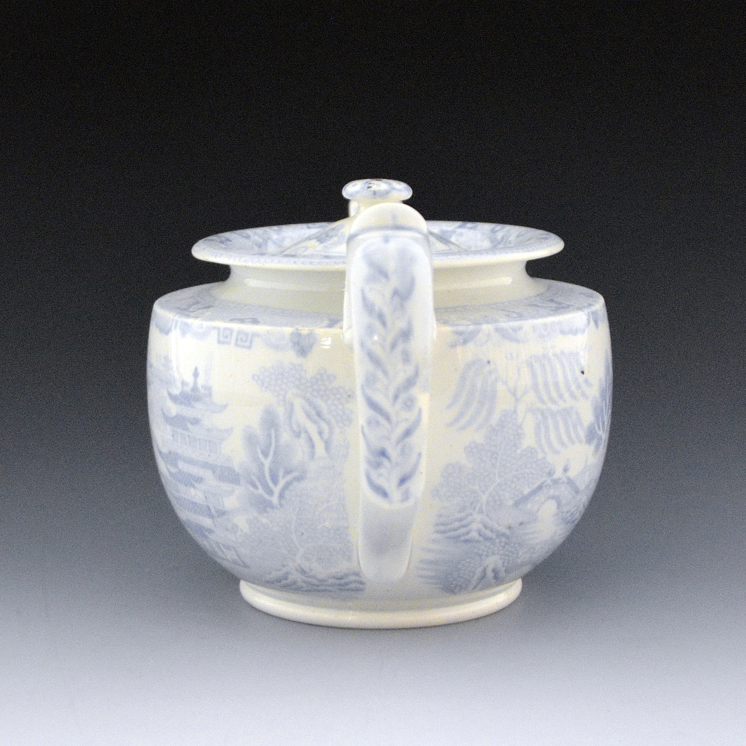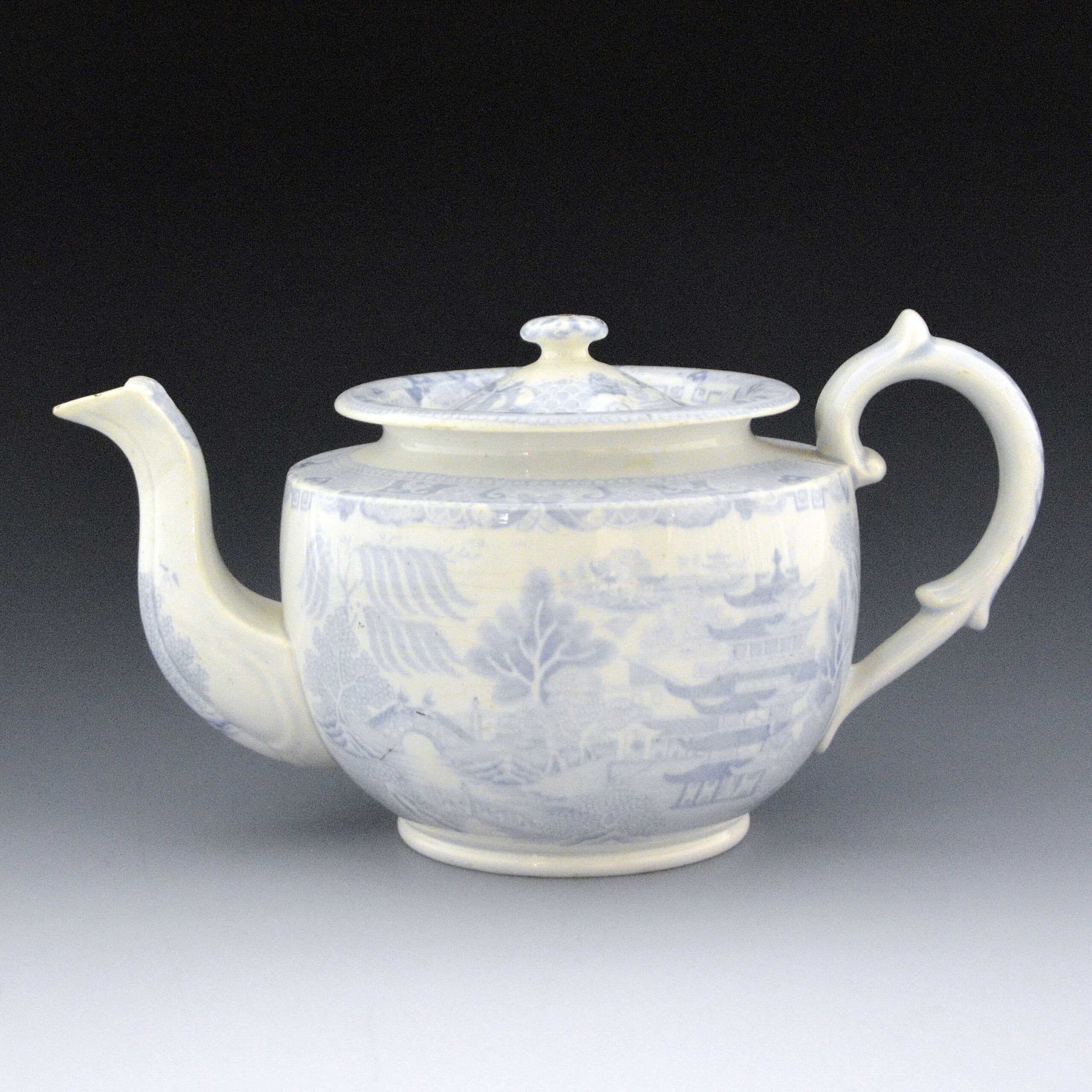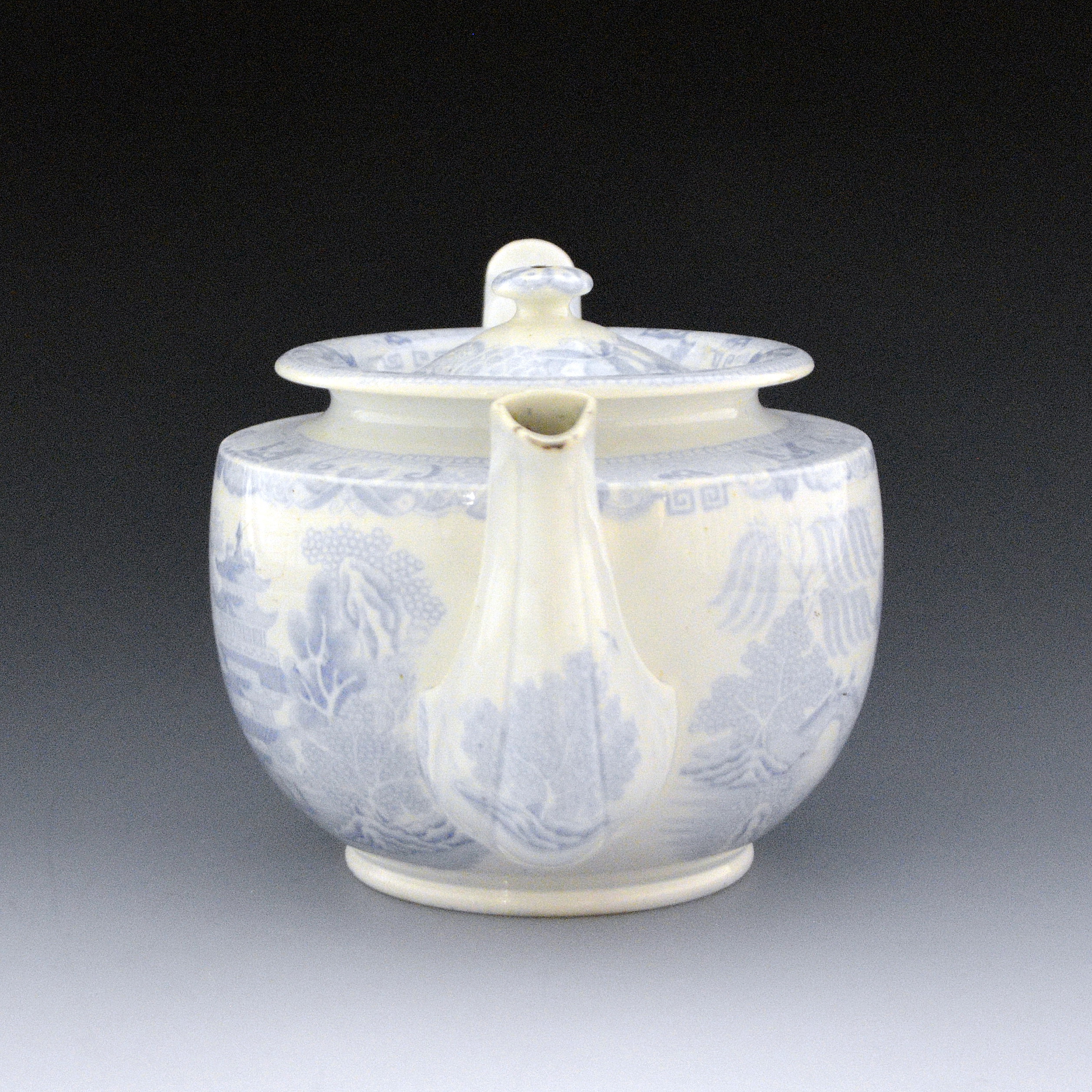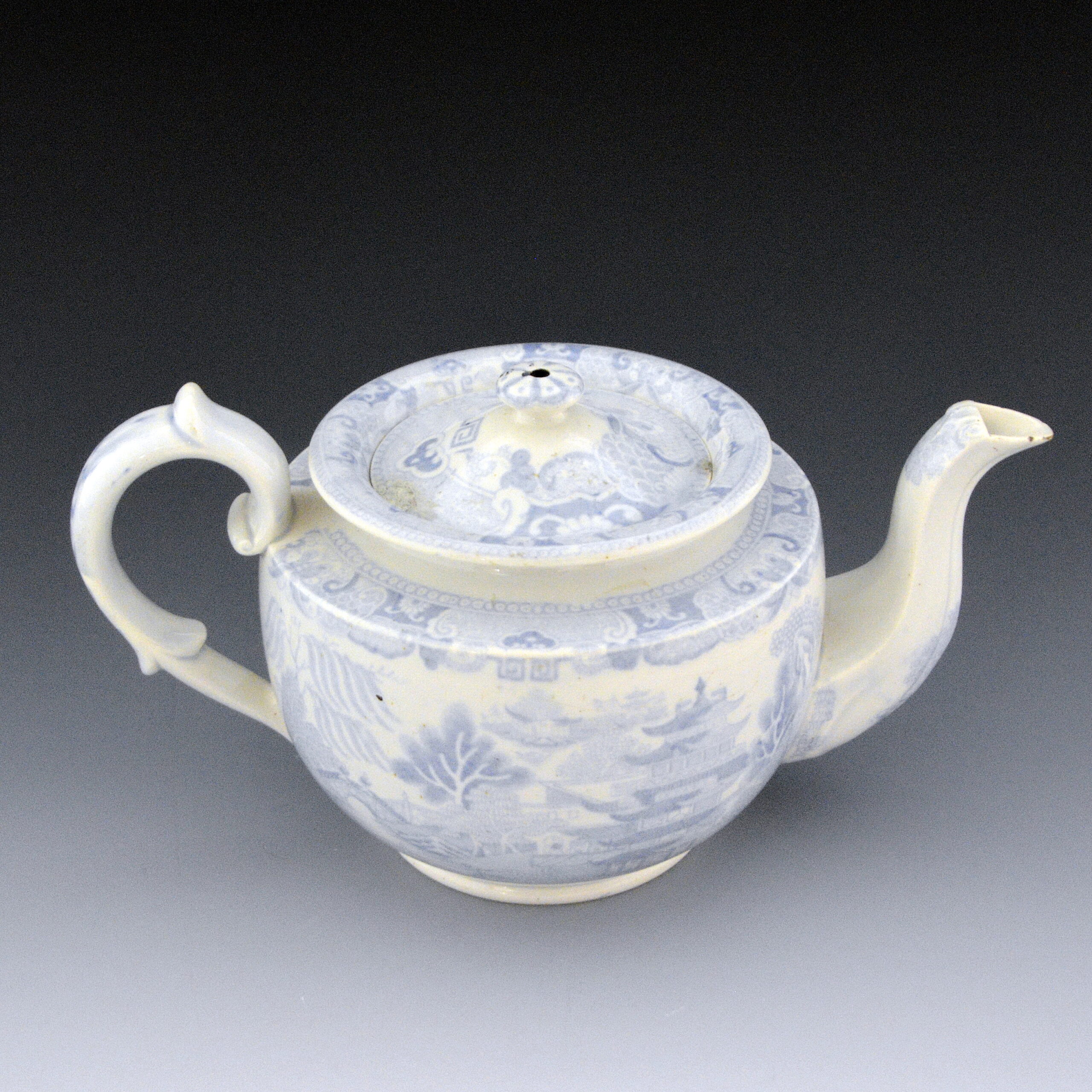 An earthenware teapot printed with the Two Temples II, Variation Broseley pattern in light blue.  Reversed pattern. Decorative fluting and relief on spout.
