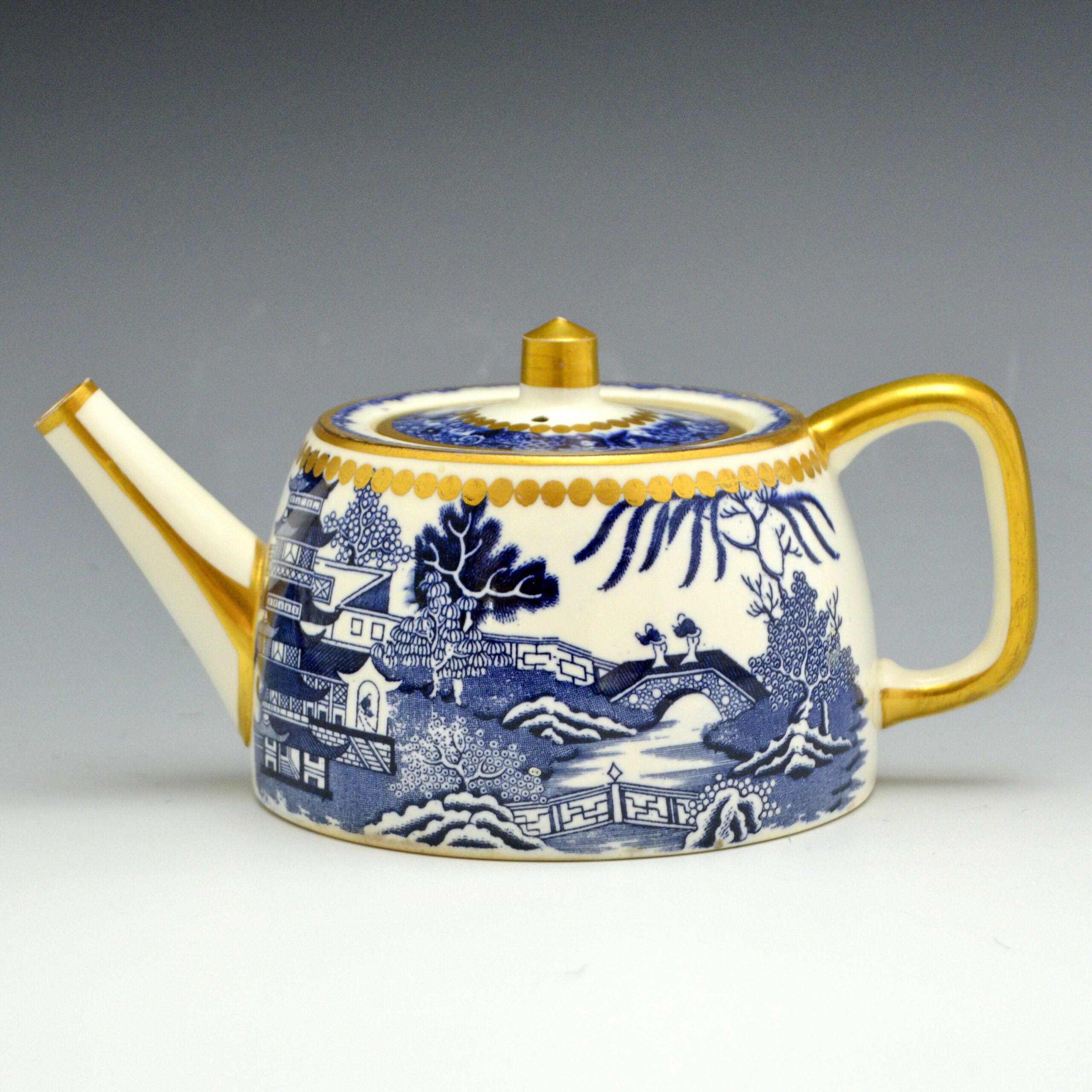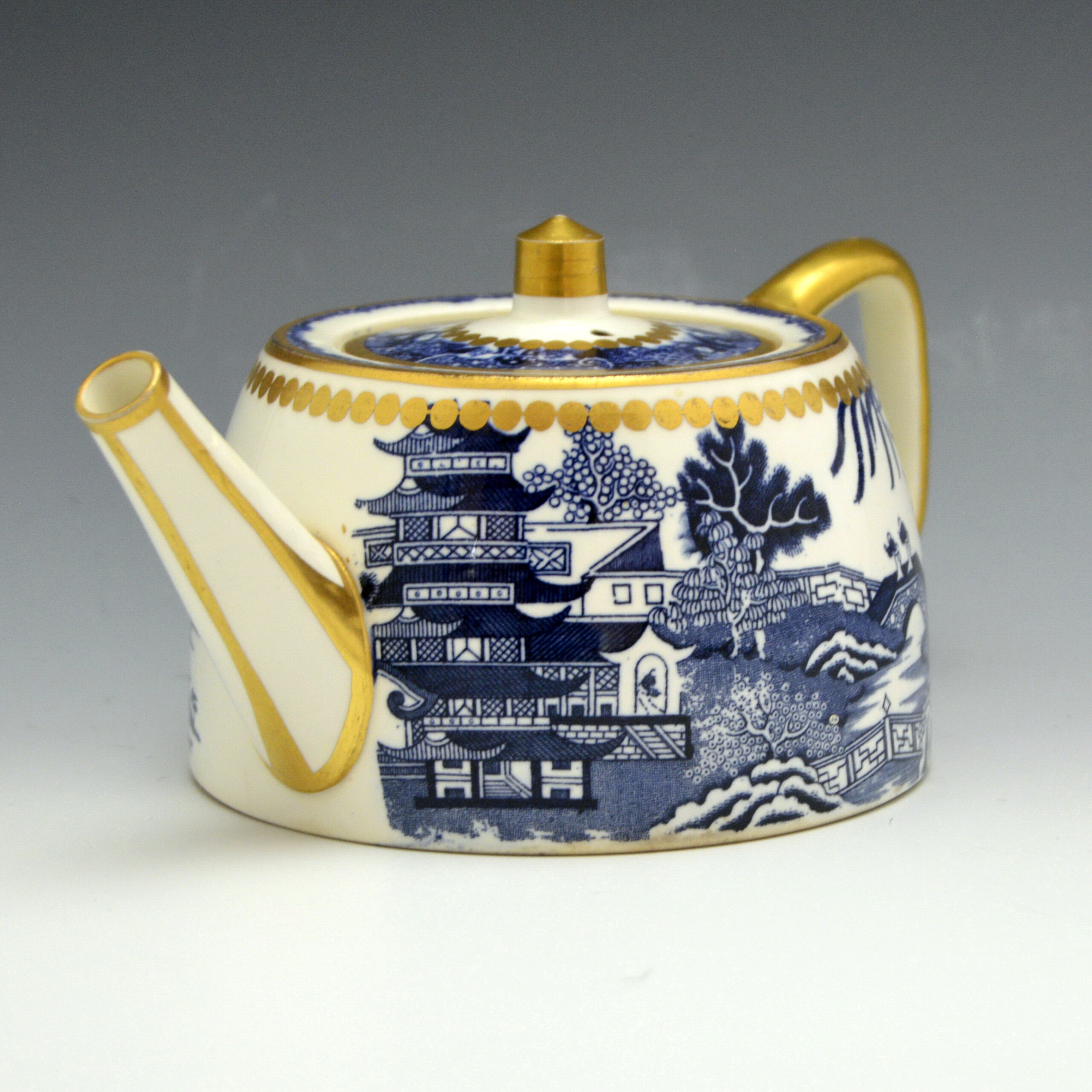 A fine two cup bone china teapot in dark blue printed with the Two Temples II, Variation Broseley pattern with gilt trim. Pattern #3588. Likely part of a breakfast set. See