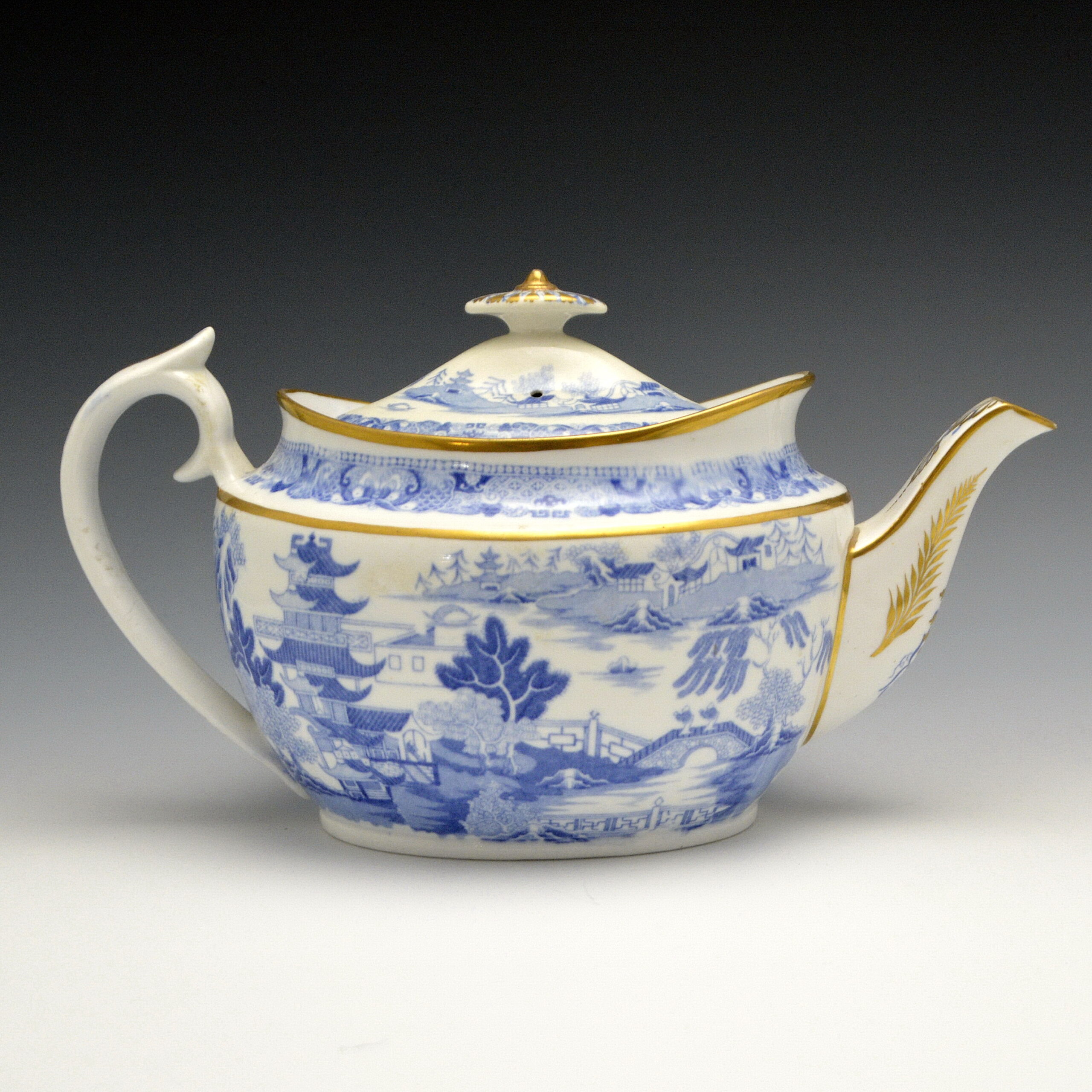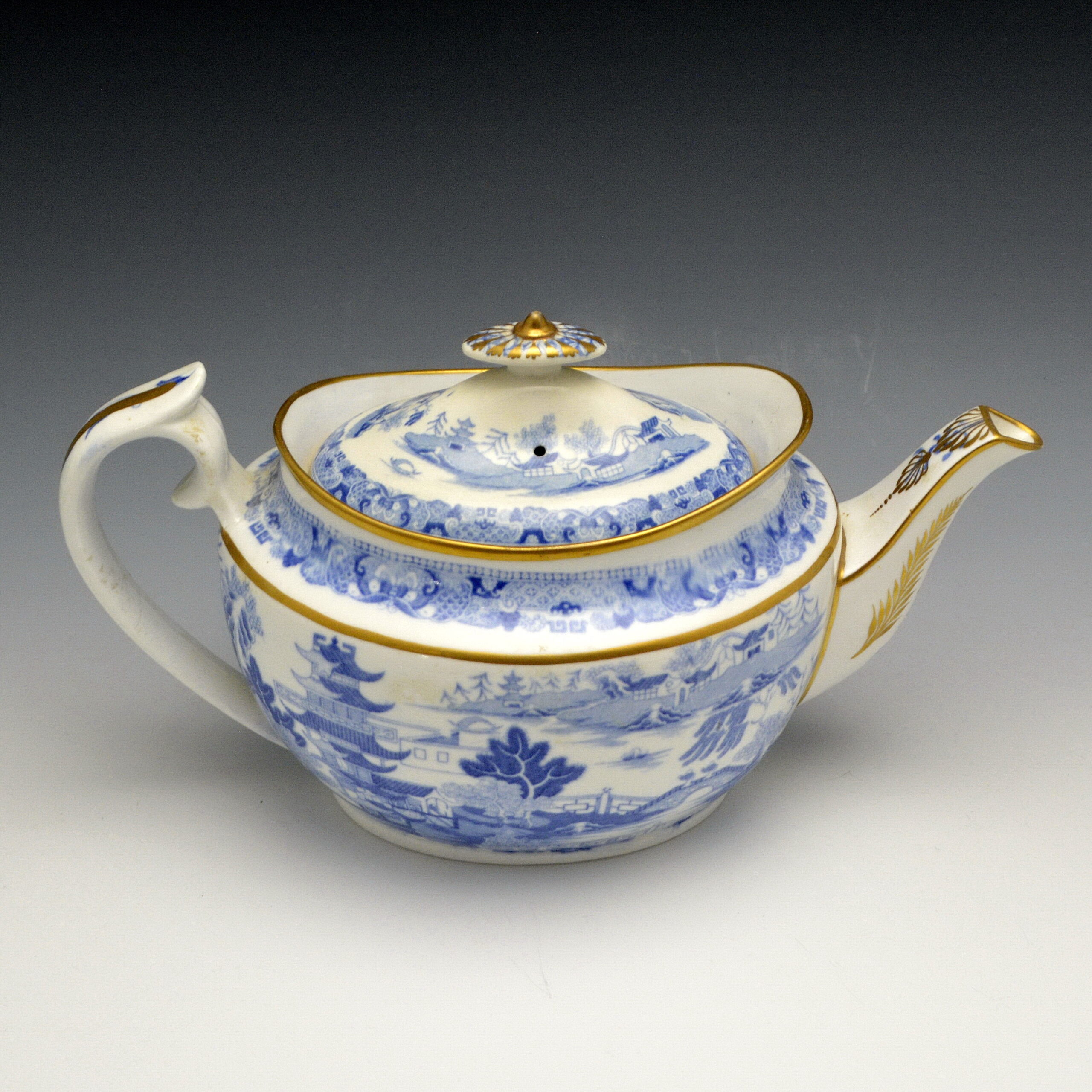 A bone china teapot printed in medium blue underglaze with the Two Temples II, Variation Broseley pattern. Very similar to one shown in Miller’s Directory of Teapots, plate 1298, p 217. Possible attribution to William Ridgway. c 1810.