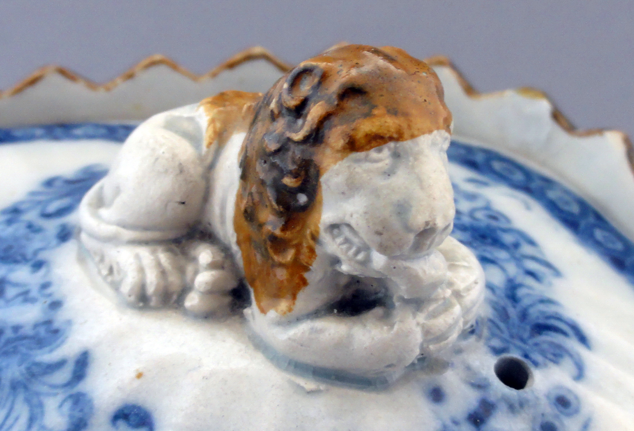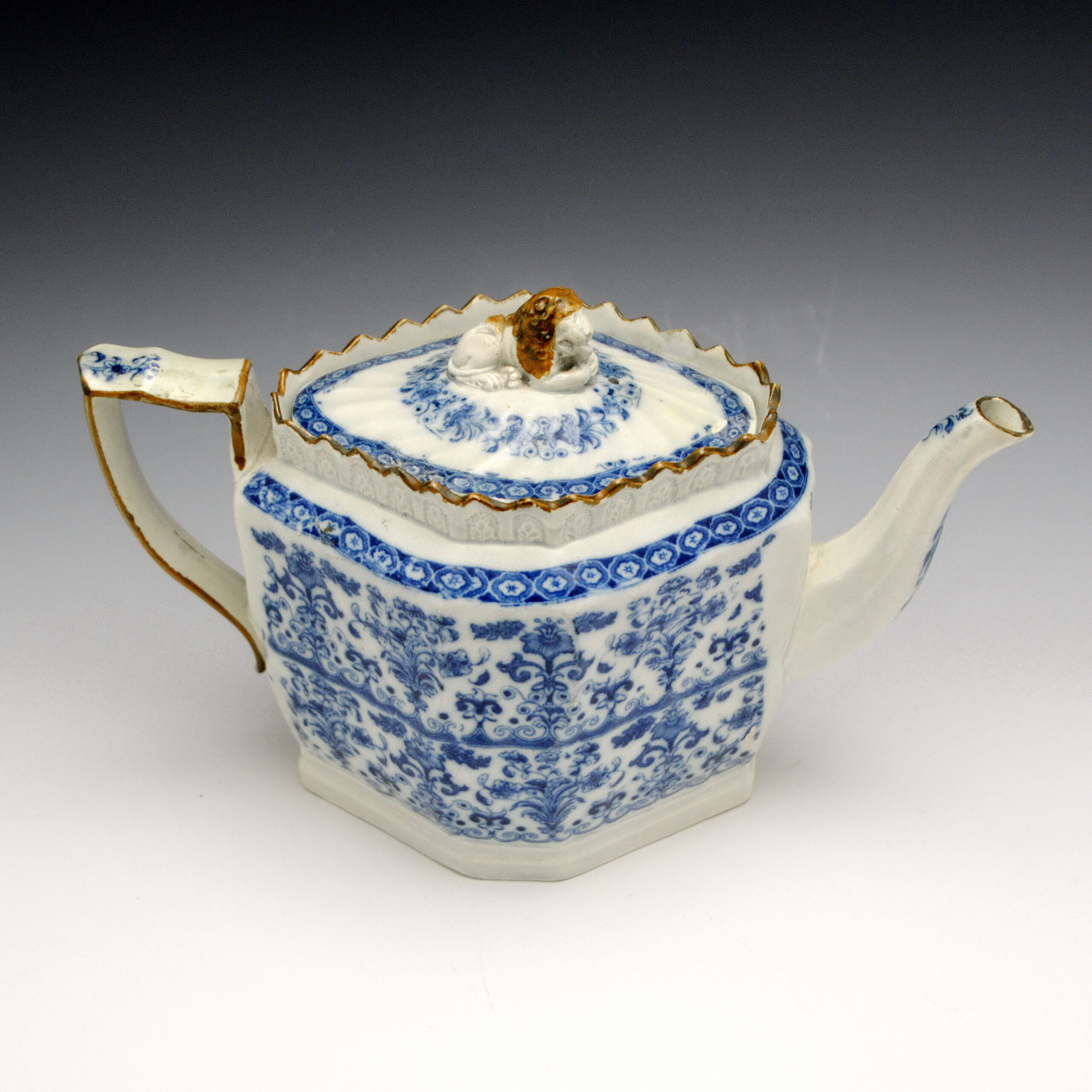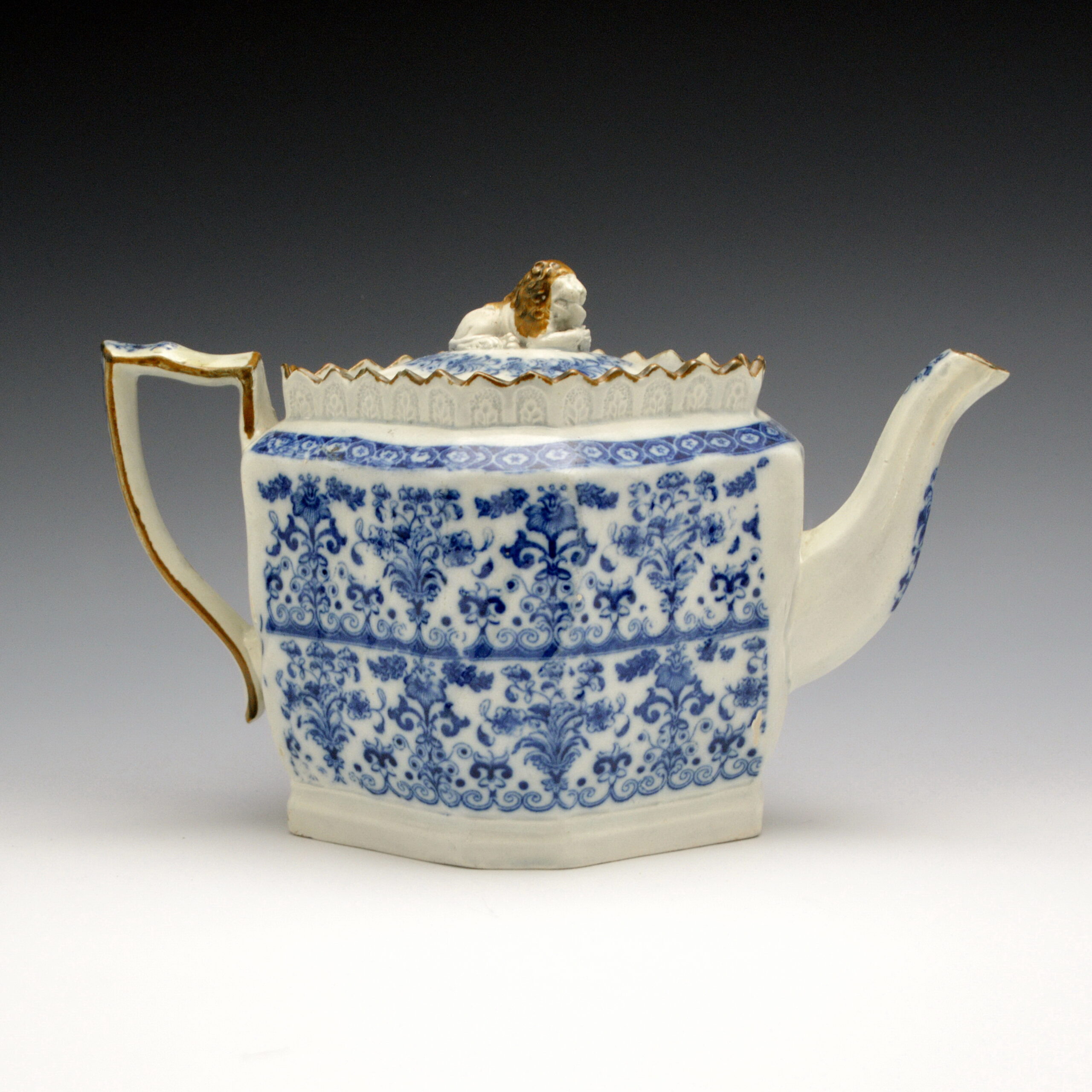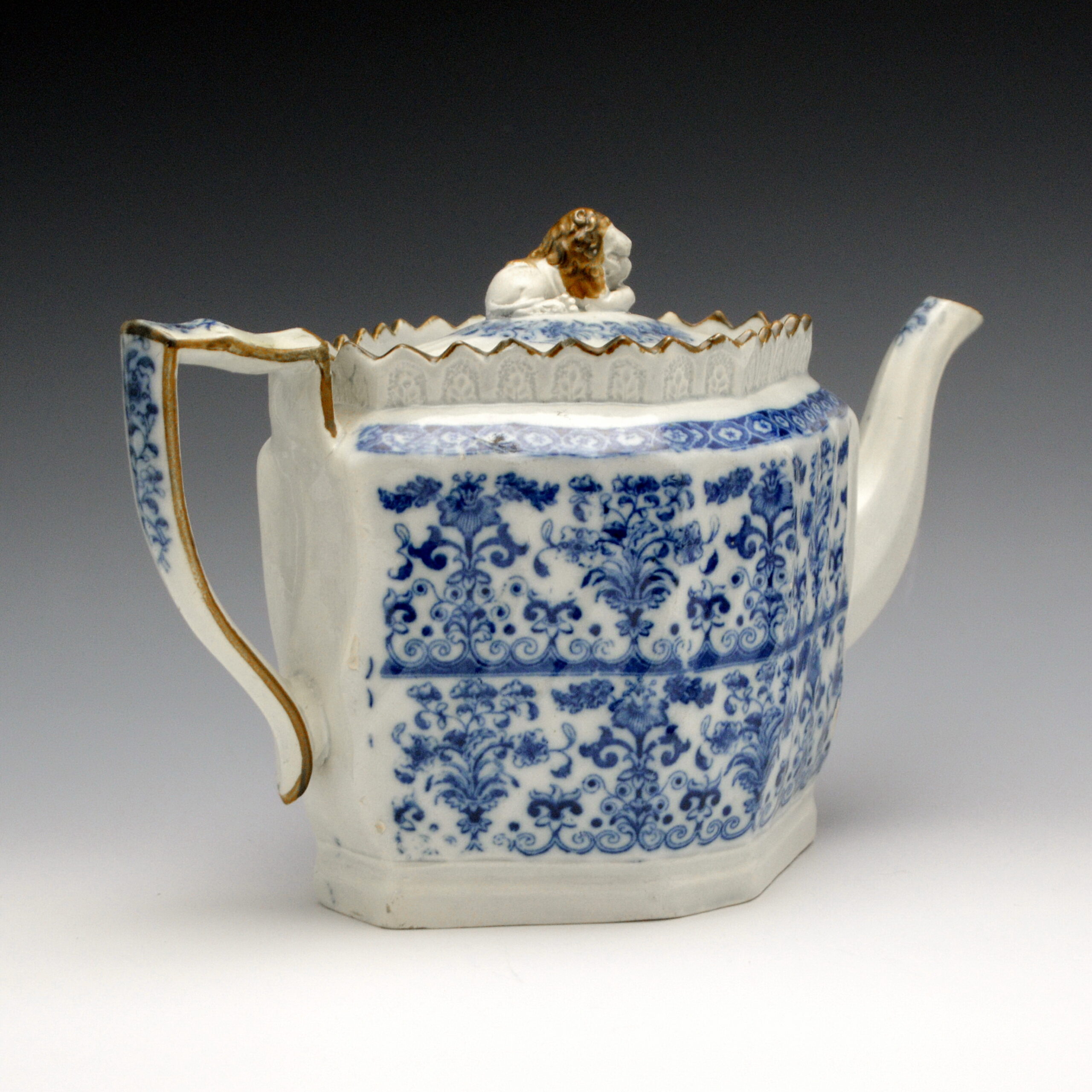 An early molded pearlware teapot printed in blue underglazewith an unidentified Chinoiserie floral pattern. It has a high fluted octagonal body, octagonal spout, molded collar. It boasts a large lion finial and unusual handle with a pad at the lower junction, small oval domed strainer and enameling on the collar, handle, spout and lion’s mane. Maker is unknown. The shape is identical to the one shown in Berthoud and Maskell’s Directory of British Teapots, plate 922, p. 154.