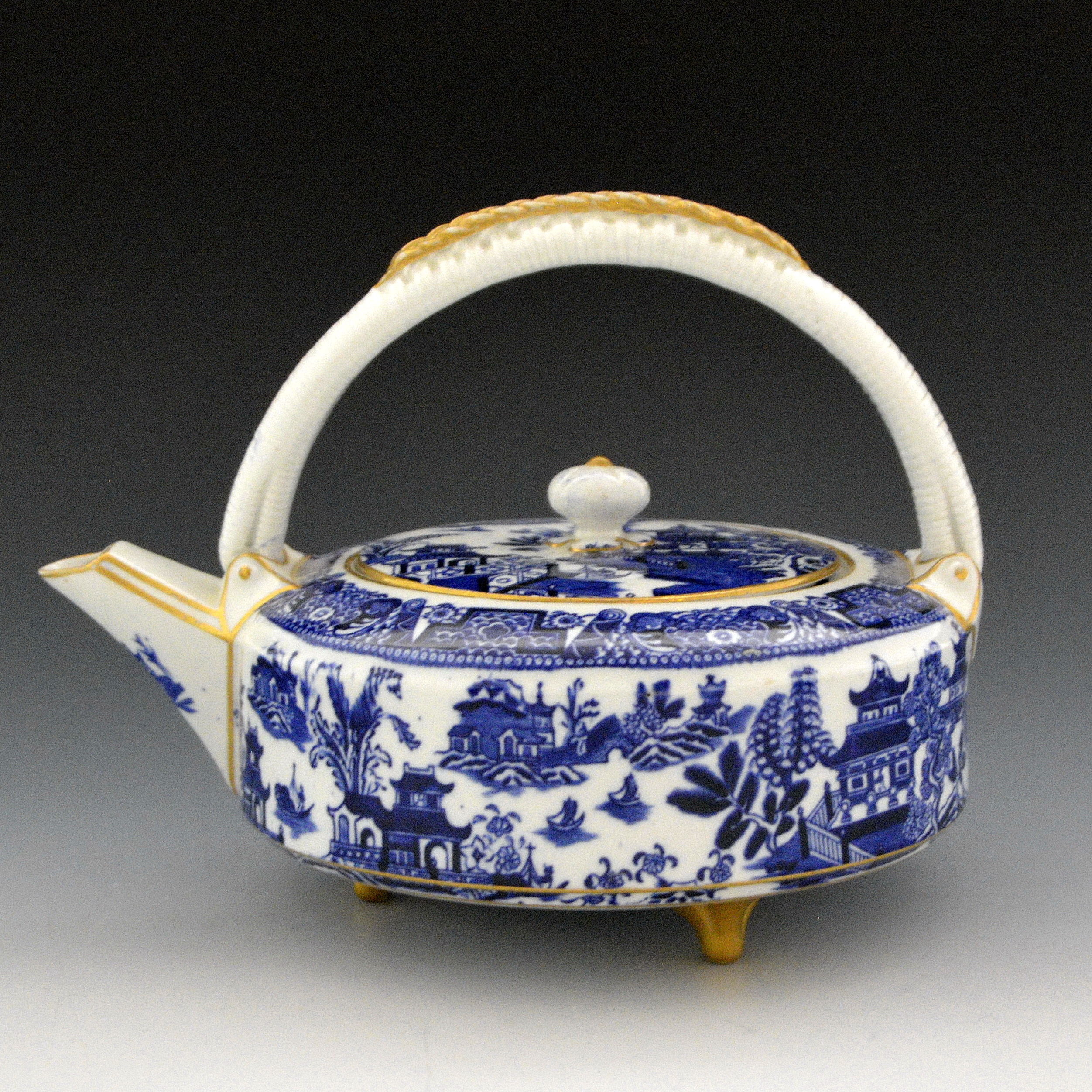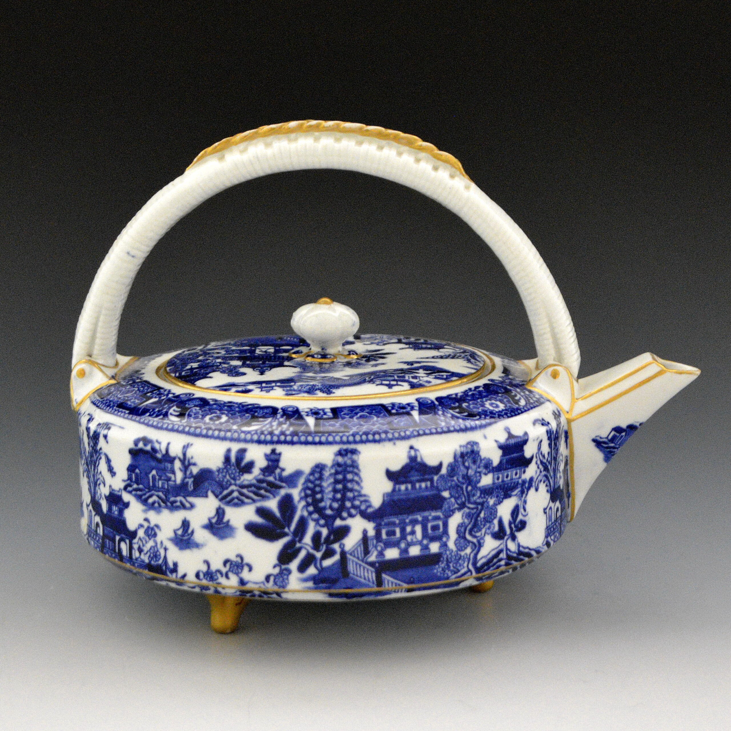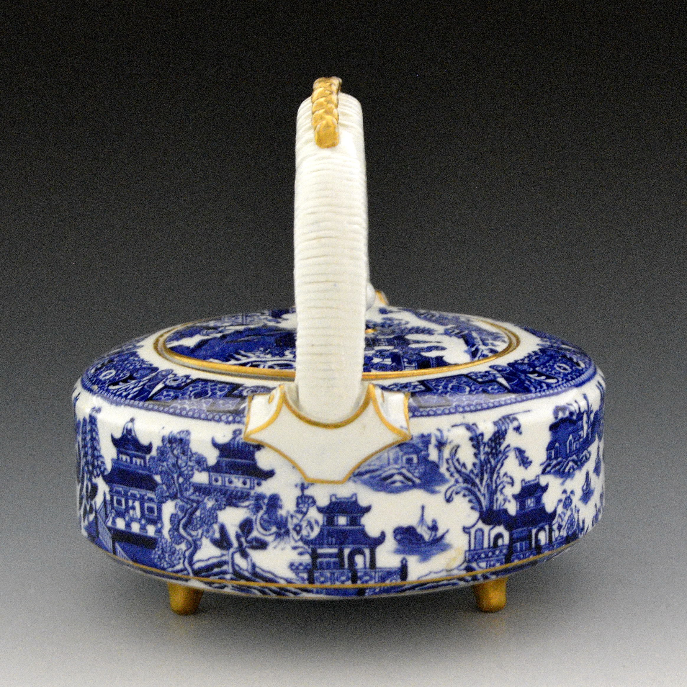 Very nice porcelain Worcester teapot, kettle shape, printed with the Worcester Willow pattern with gilt trim added. Alternate names for the pattern are Full Willow and Royal Worcester Willow Pattern. The handle was molded with a pattern to suggest a reed handle. The pot sits on three gilded feet. Mark is “P”, indicates theyear 1879. Pot mold was probably patterned after a Chinese teapot form. 7″ high. This is pattern number B389, known as willow. The same pattern with pattern number B446 is listed in the pattern books as Full Willow. On Crown Ware (earthenware), this pattern, number D33, is listed as The Royal Worcester Willow Pattern.