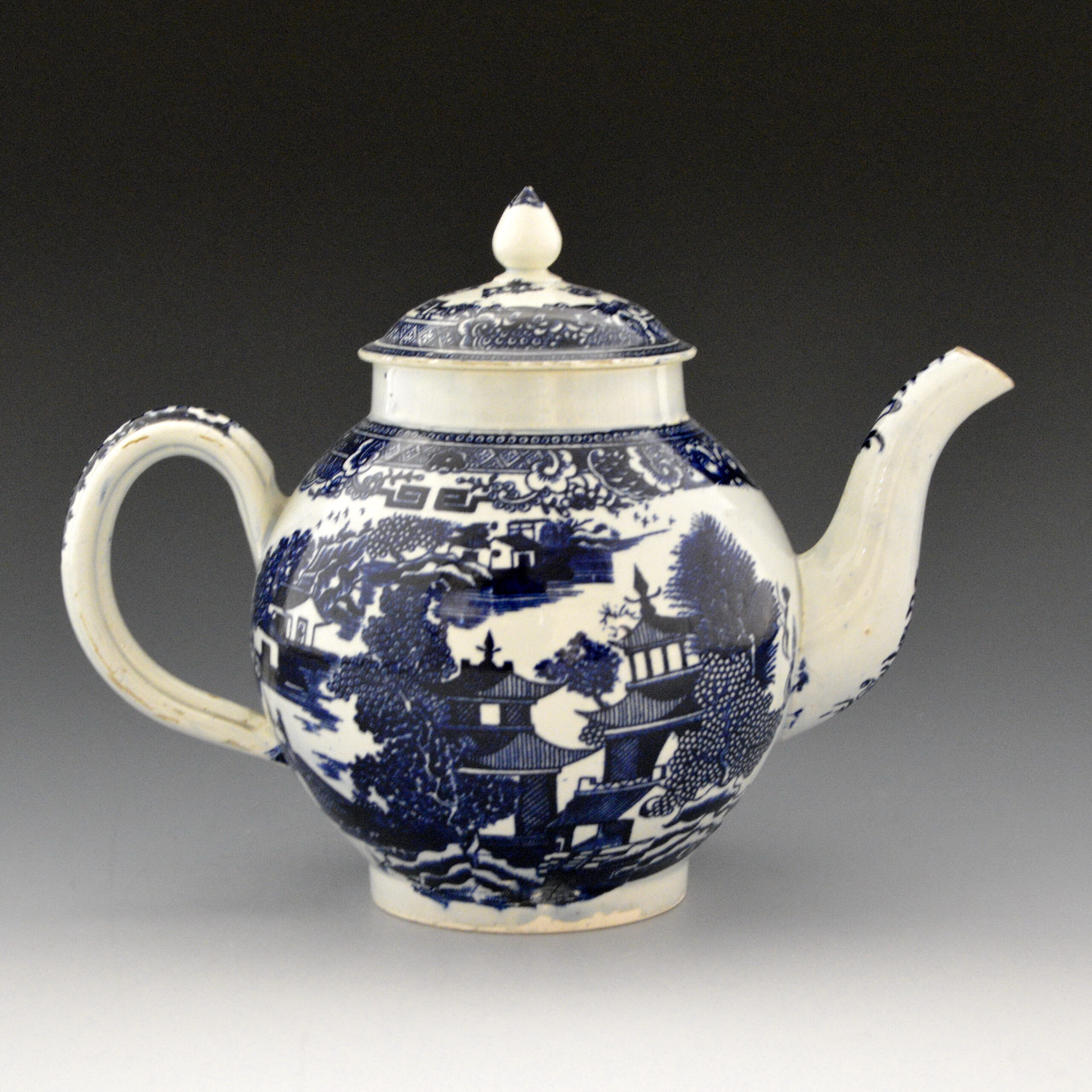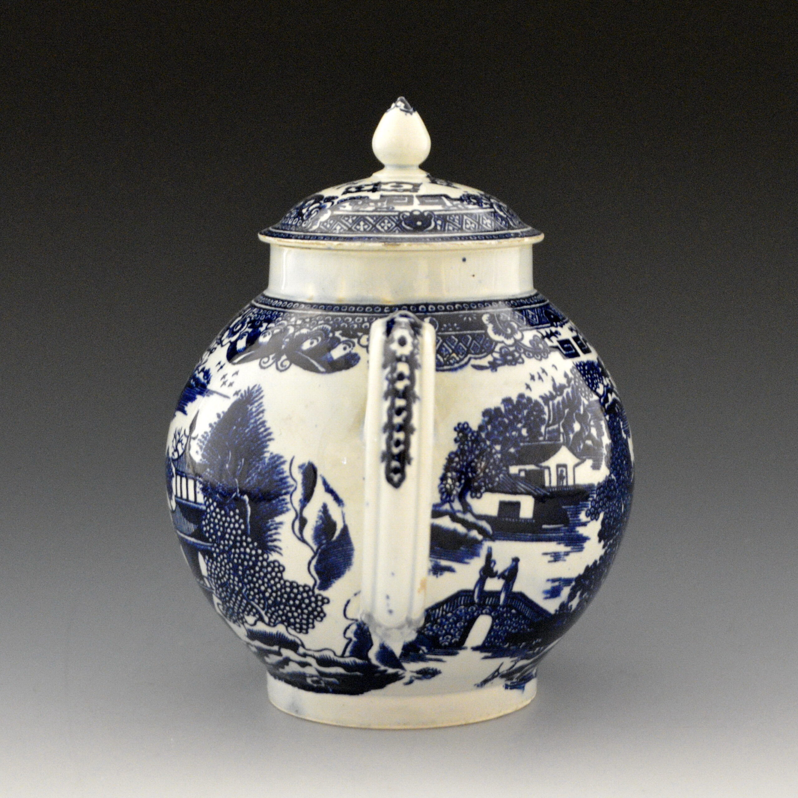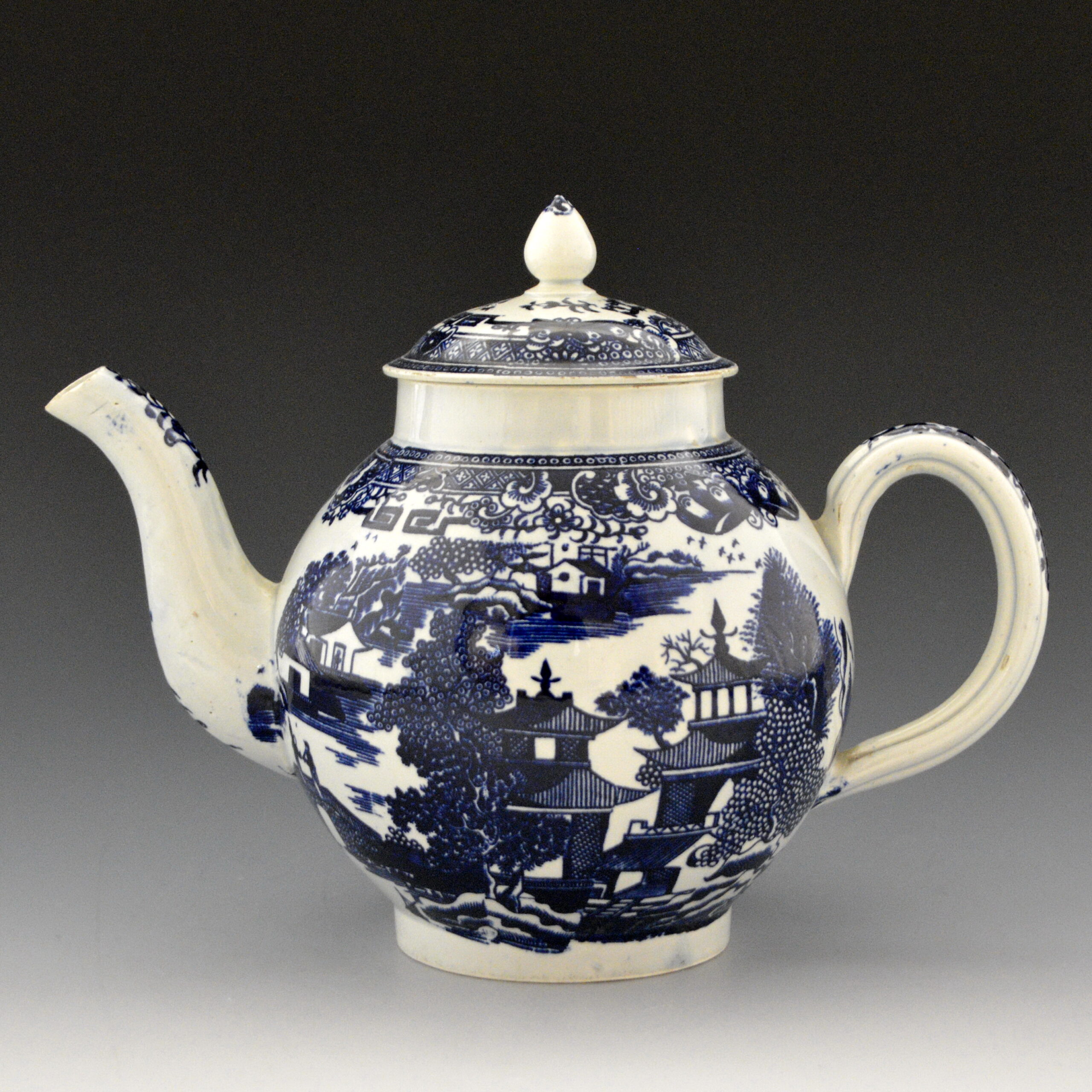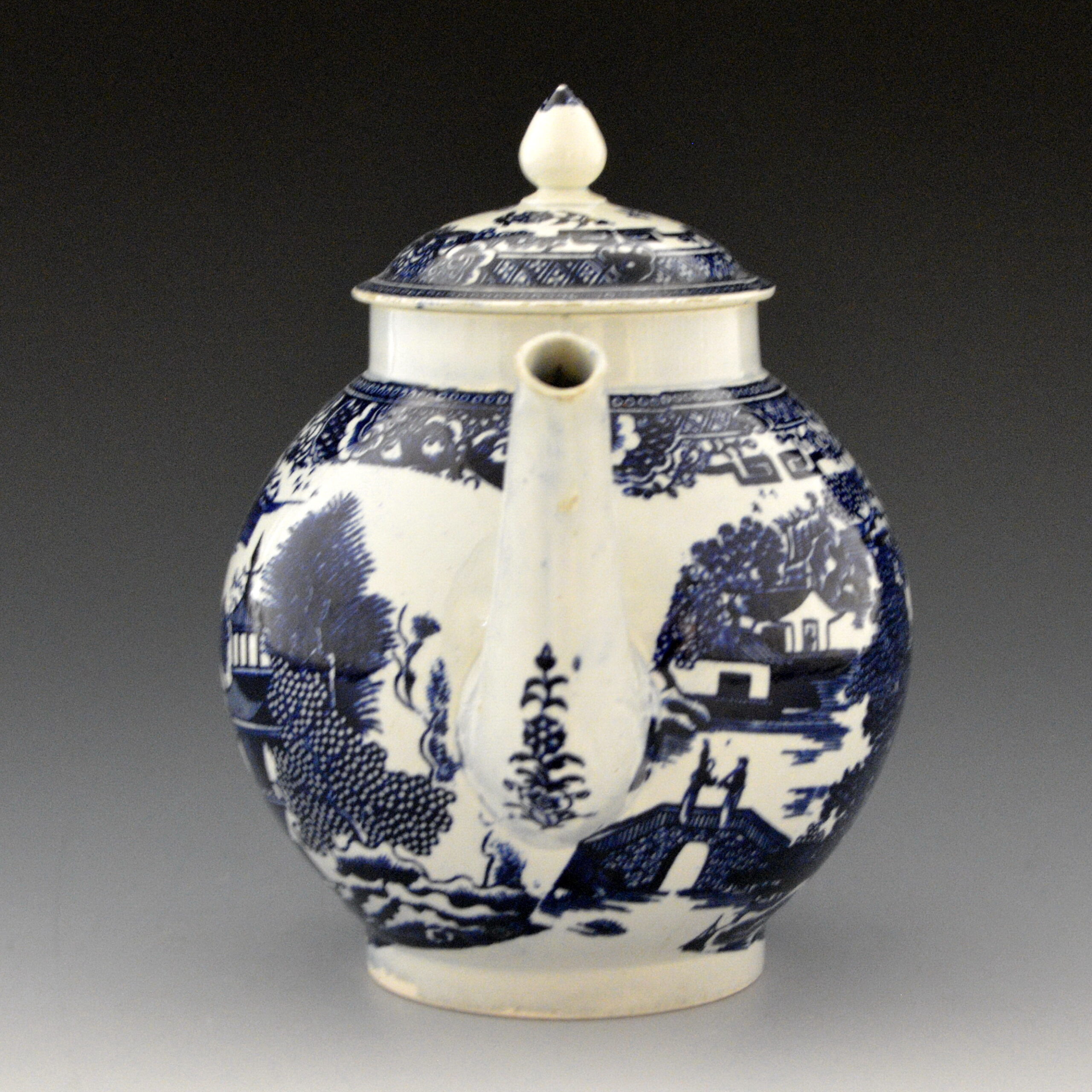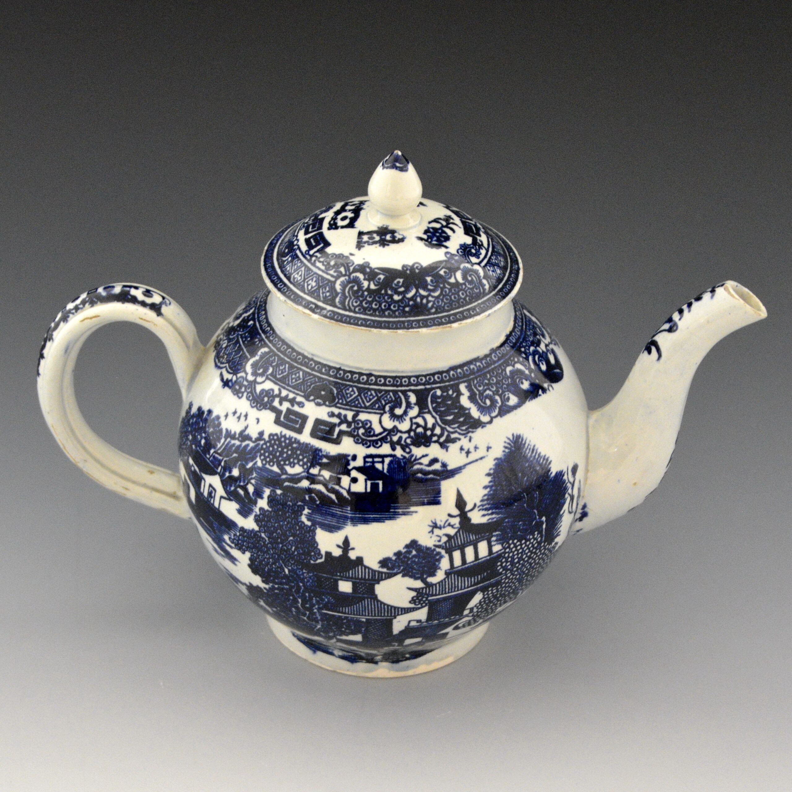 Rare and fine example of an early pearlware teapot in globular shape. Dark blue under glaze transfer printed from a line-engraved Conversation pattern. This pattern is a slight variation of Conversation #3 in the TCC Pattern Database and on a Plate  (P85) in this collection, however the borders are different.