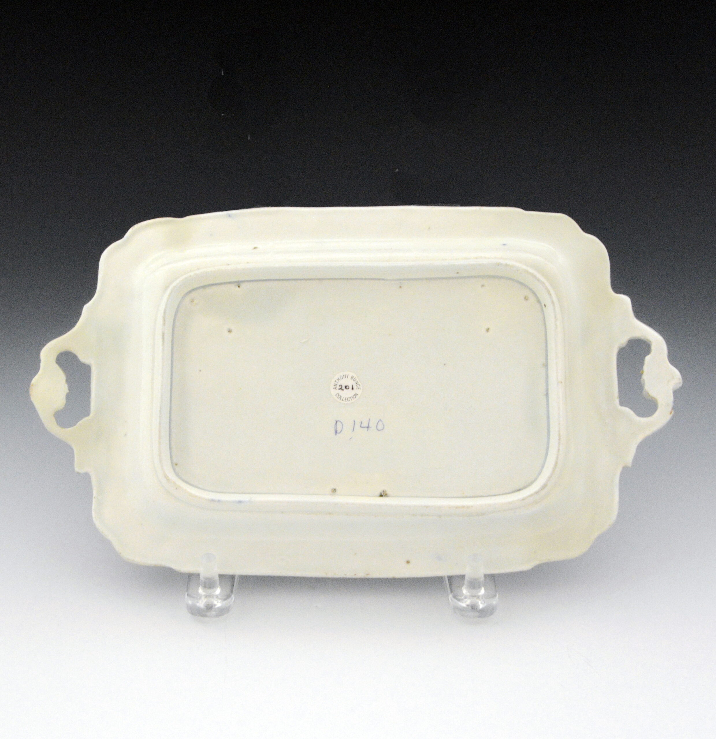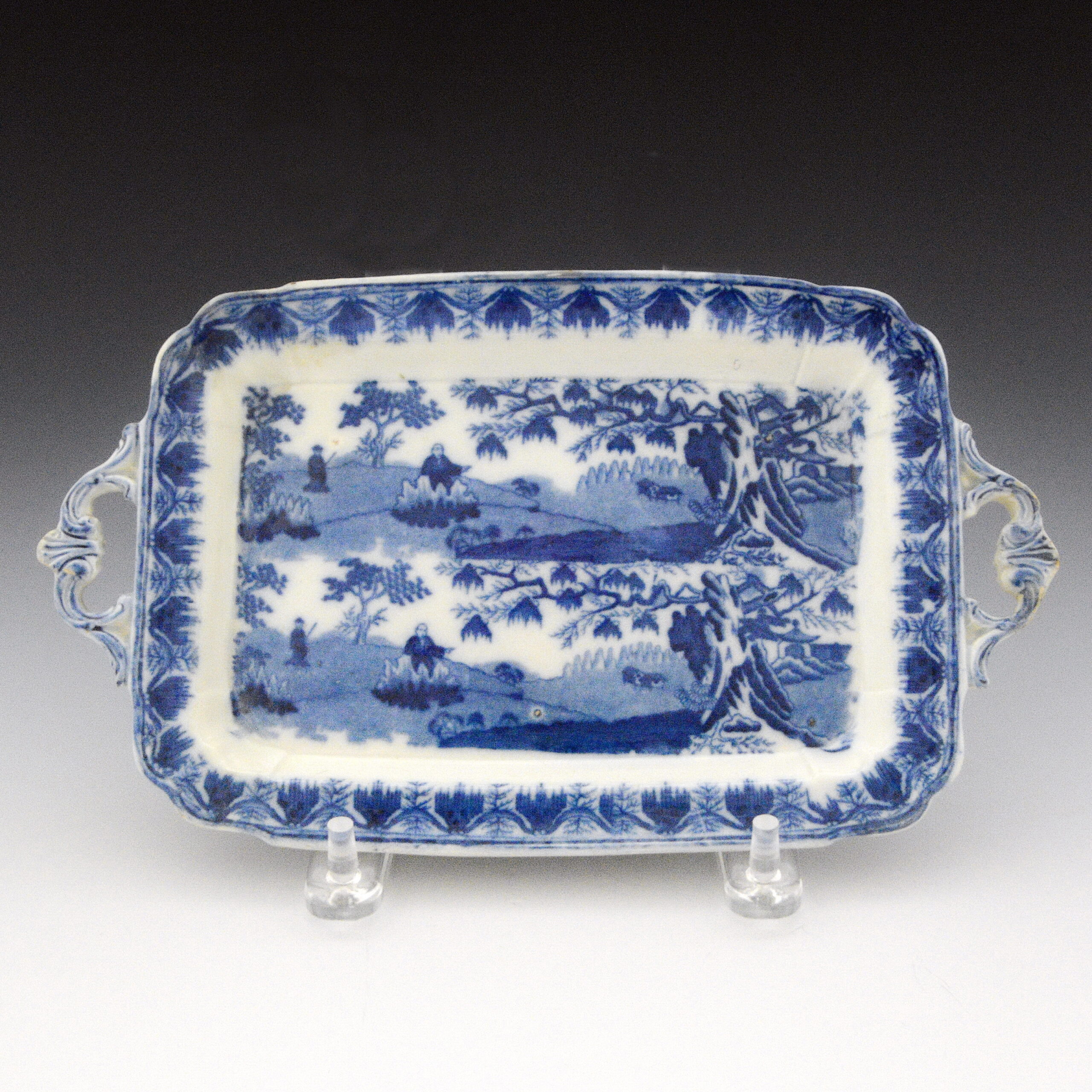 A  molded handled tray printed with the Chinese Men in a Garden pattern. The pattern features two Chinese men walking in a garden. Large-leaf plants are at their feet and oriental trees drape down overhead, framing the scene above. The same large leaves are repeated in the border design. The pattern is printed twice indicating that it was originally engraved for a different item. Molded scroll shaped handles painted with a blue ground. The pattern is attributed to Davenport with marked examples documented in the TCC database.