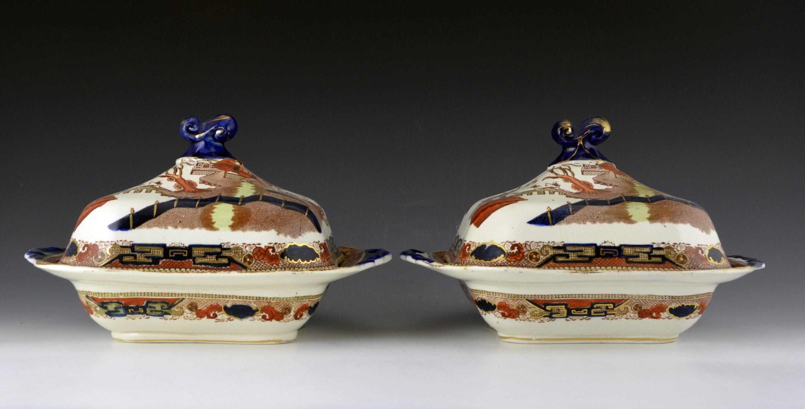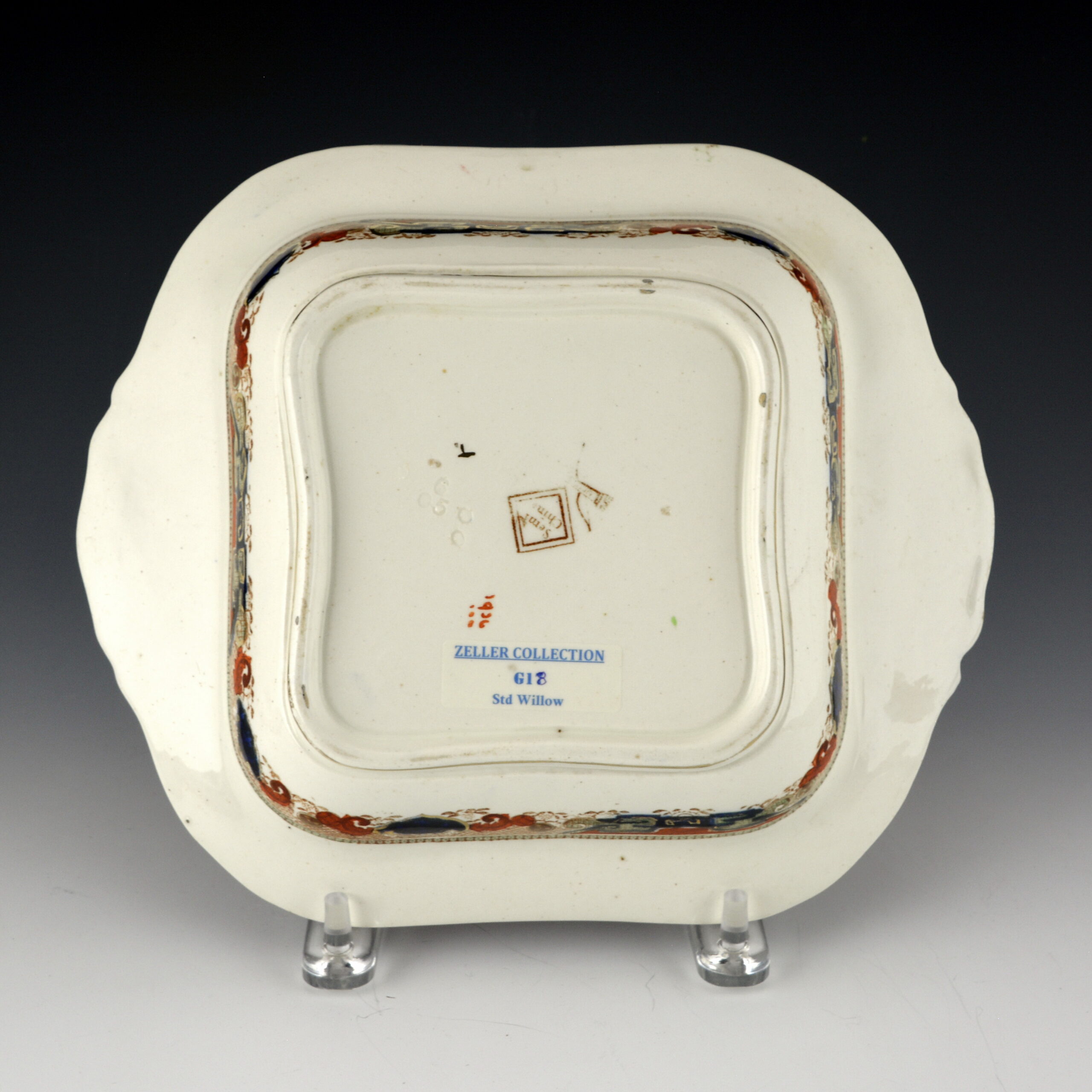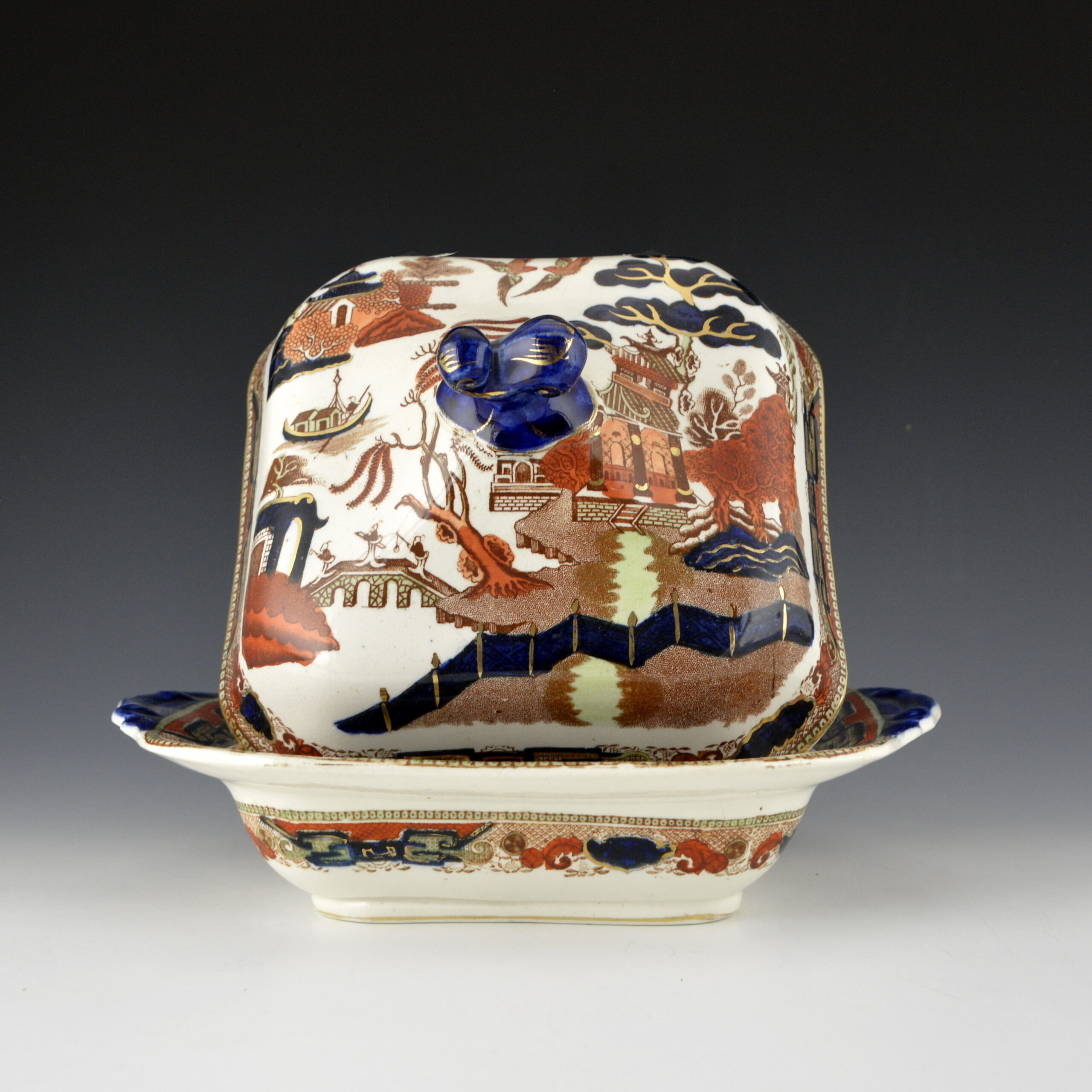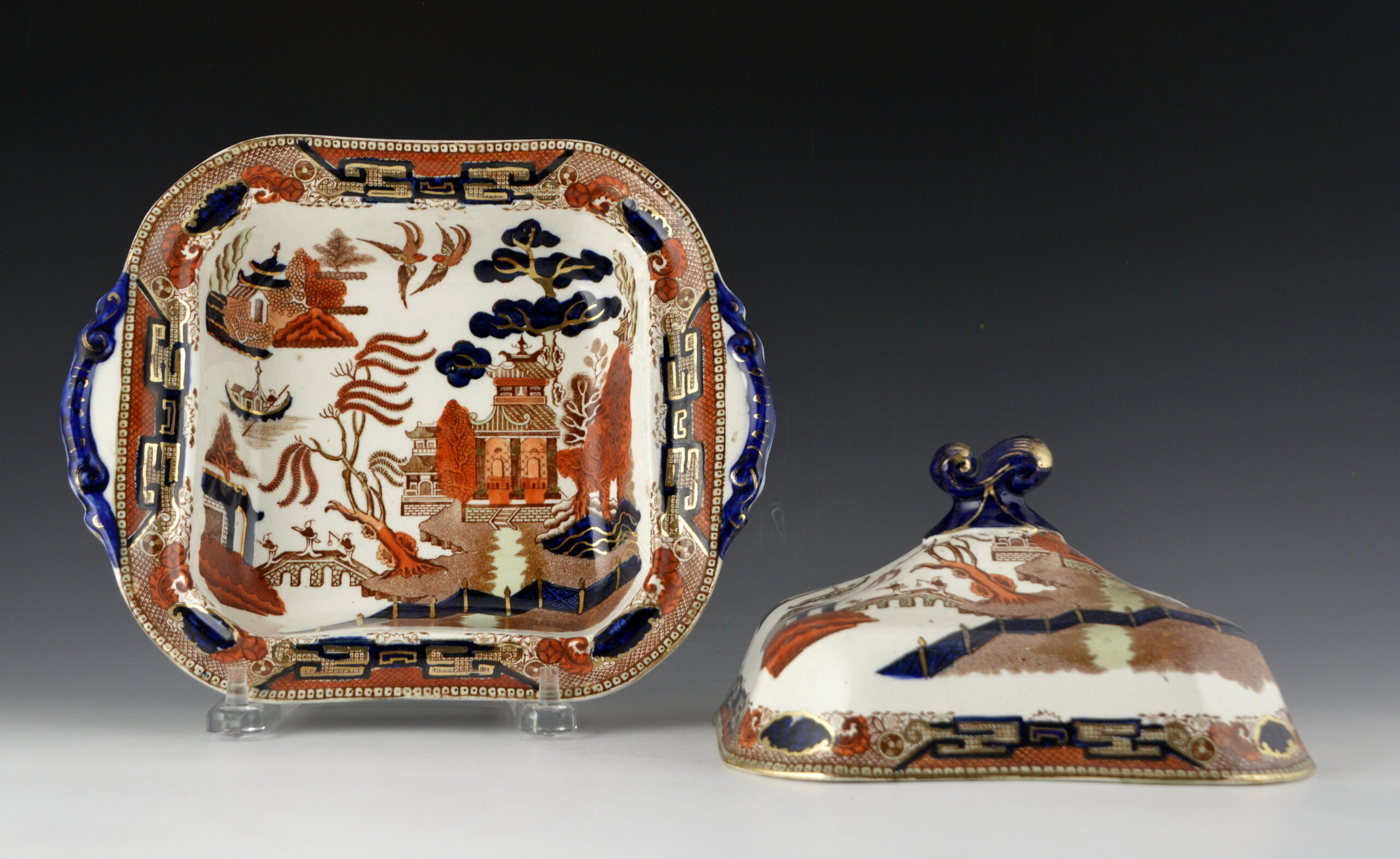An earthenware covered vegetable tureen printed in brown underglaze with the Standard Willow pattern and enameled overglaze with cobalt blue, rust and green with gilt decoration added. One of a pair (see G18B for the second one). These are very early twentieth century examples, with impressed date of “05”, 1905.